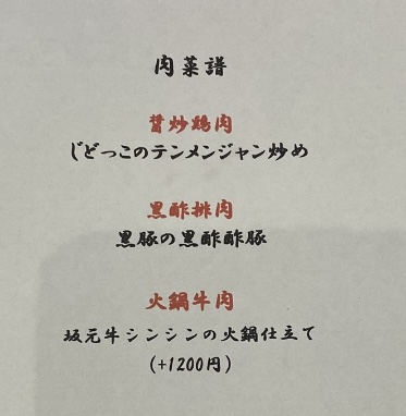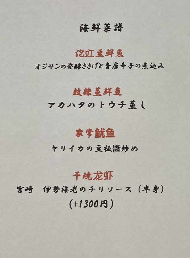 「川」のコースは、魚料理4種、肉料理3種の中からそれぞれ一品を選ぶスタイル。ベースは決まっているのに、その日の気分や好みに合わせて構成を変えられるのが楽しいところです。さらに余裕があれば、〆に担々麺や炒飯を追加できるという遊び心ある仕組みも嬉しい。