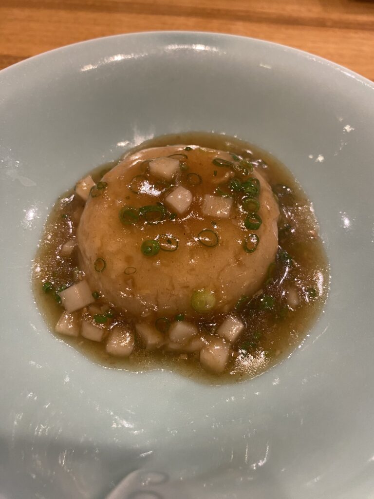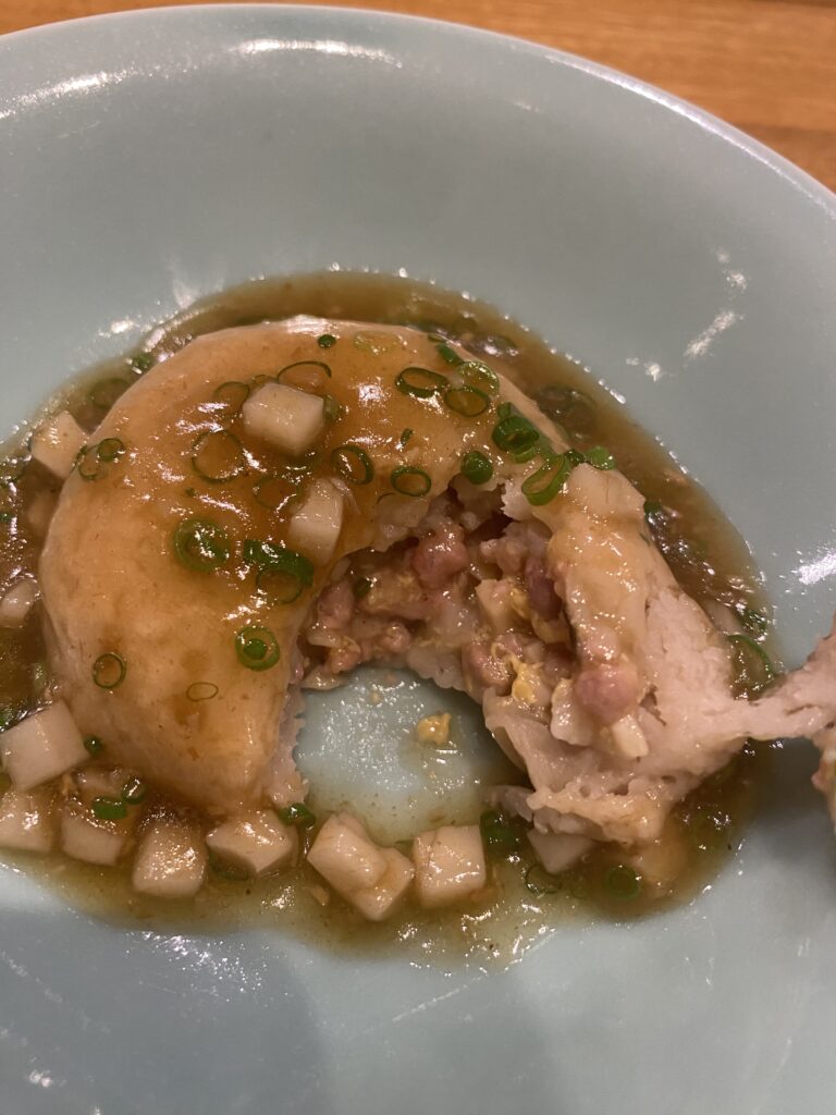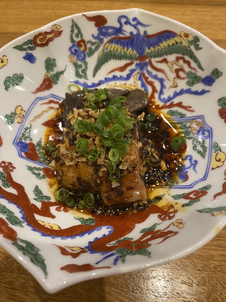 菊芋の自然な甘みに、肉味噌の濃厚さ、サーチャー醬の香りが重なって、奥行きのある味わい。見た目は素朴なのに、口に運ぶと手間ひまのかかった滋味深さが広がります。