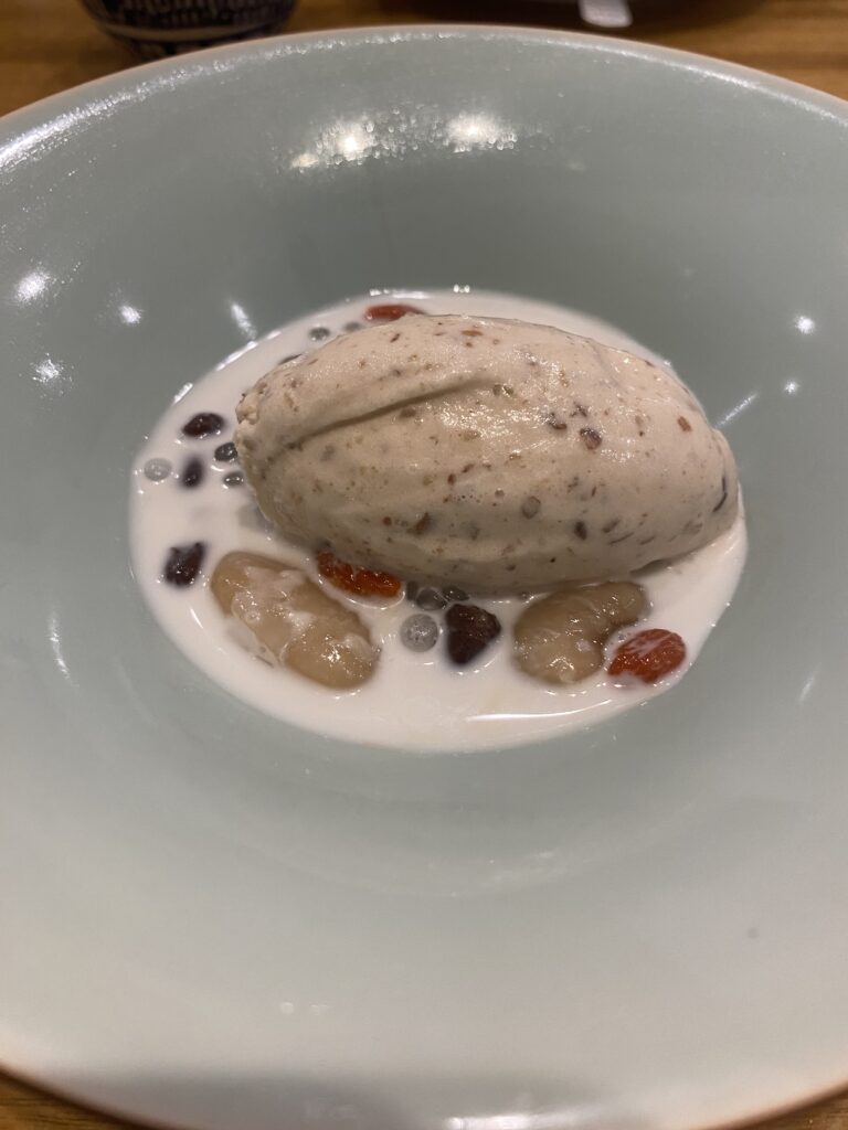 串間「夢の塩」を使った杏仁豆腐、自家製渋皮煮アイス、4種の豆とタピオカのココナッツ仕立て。どれも甘さ控えめで後口が軽やか。最後まで香りと食感の妙を楽しませてくれます。