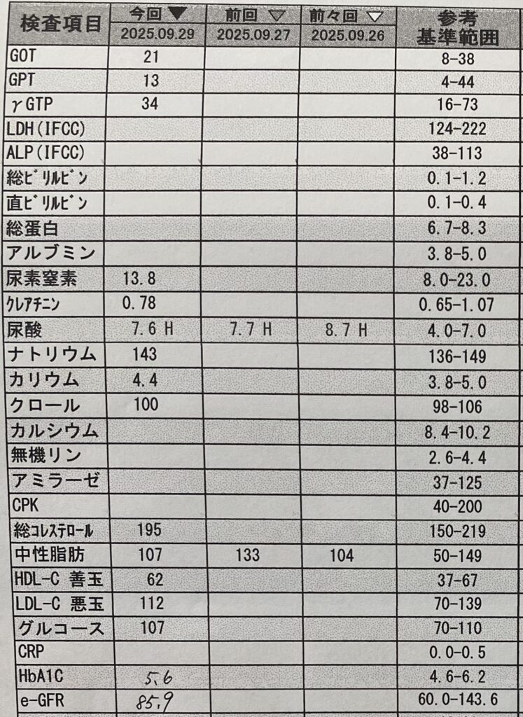 尿酸値は即日で反映されるとは限らず、数日前の食生活やアルコール摂取状況によっても左右されます。今回は直前の食事が軽めだったため、カバーできたのかもしれません。