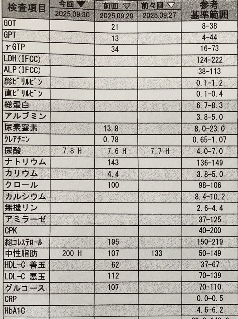 結果はほとんど変わらず。むしろ中性脂肪は下がっており、全体的に安定していました。その他の数字もどれも正常値。