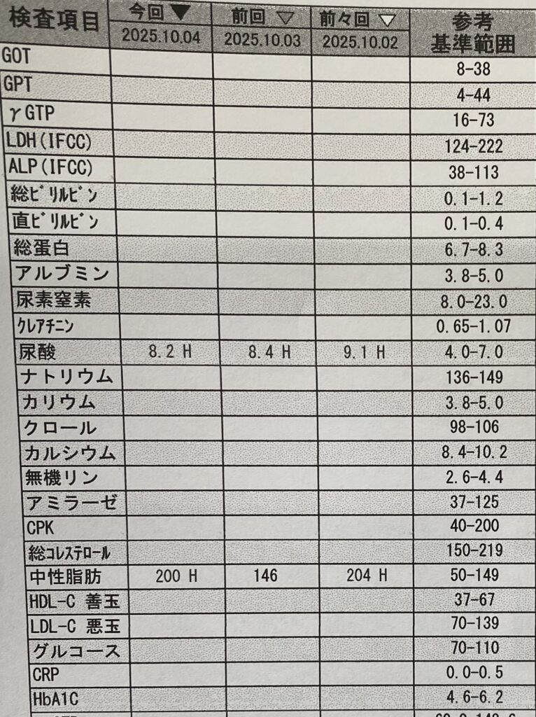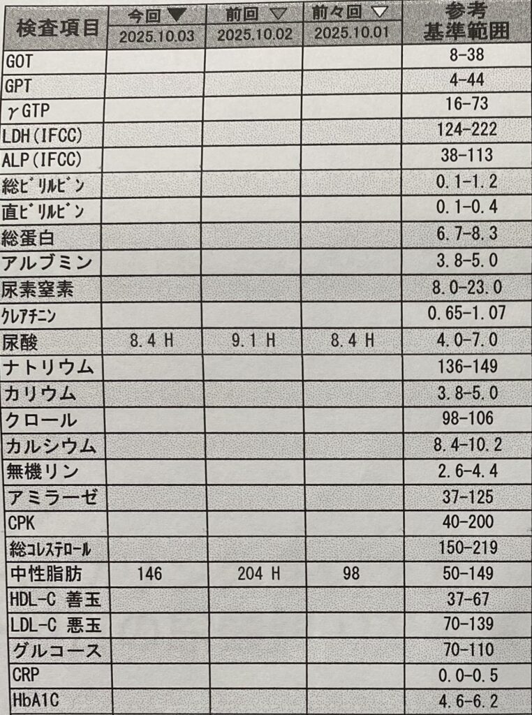 昨日9.1まで上昇してしまった尿酸値ですが、今回は8.4へと低下。中性脂肪も204から146へと下がりました。