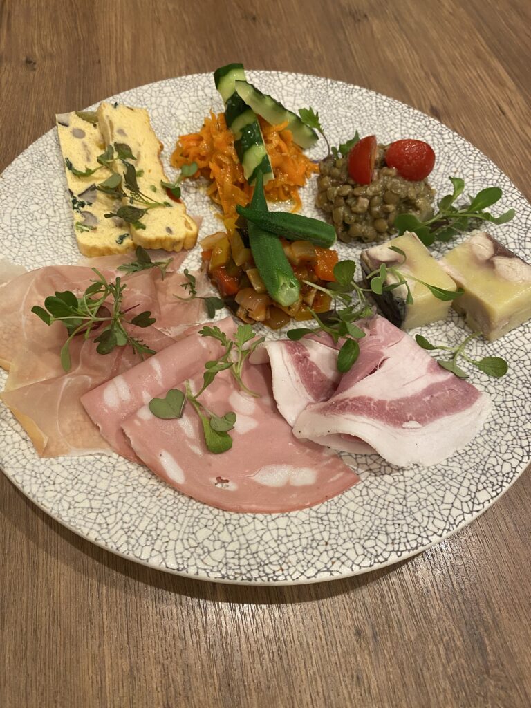 彩り豊かなプレートには、生ハムやマリネ、ラタトゥイユなどが並び、一口ごとに味の変化が楽しめます。
