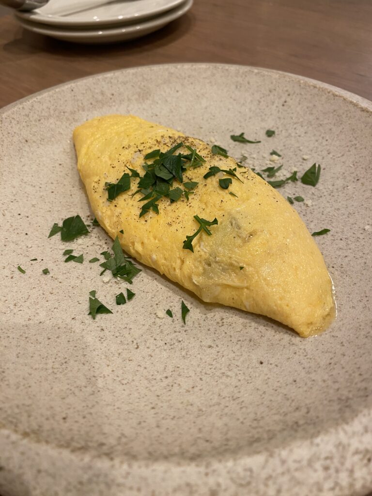 ふんわり焼かれた卵の中にブルーチーズがとろけ、香り高くコクのある味わい。塩味は控えめで、ワインの酸味とよく合います。