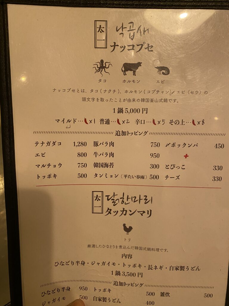 韓国料理の定番、ナッコプセ。テナガダコ(ナクチ)、ホルモン(コプチャン)、海老(セウ)を組み合わせた鍋料理で、旨味の濃いスープと辛味が合わさる豪華な一品です。宮崎の「太一家」でいただいたこのナッコプセは、最後の〆までしっかり楽しみました。