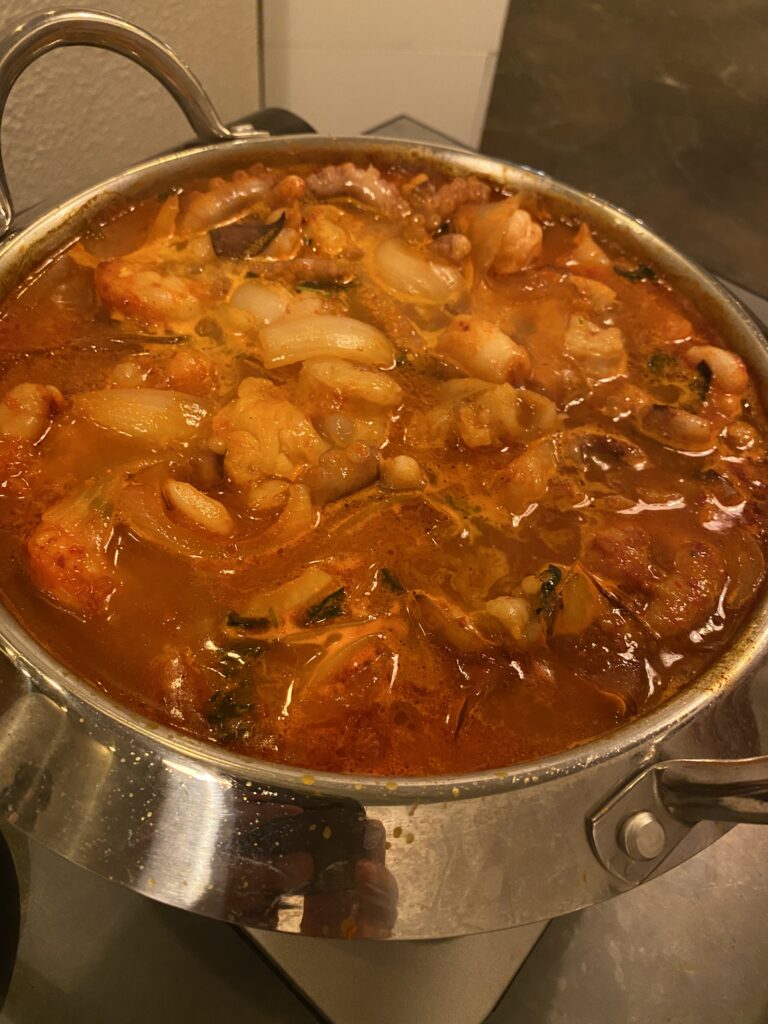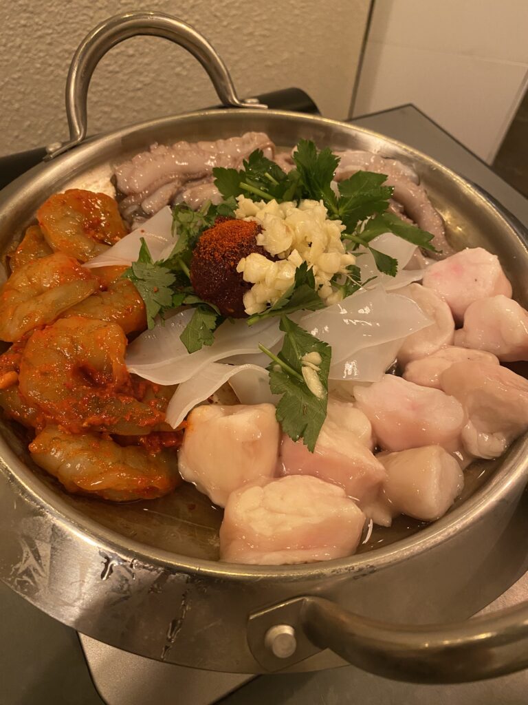 この日のメインは ナッコプセ。韓国語で「ナクチ(テナガダコ)・コプチャン(ホルモン)・セウ(海老)」を組み合わせた料理で、旨味の三重奏とも言える豪華な鍋です。