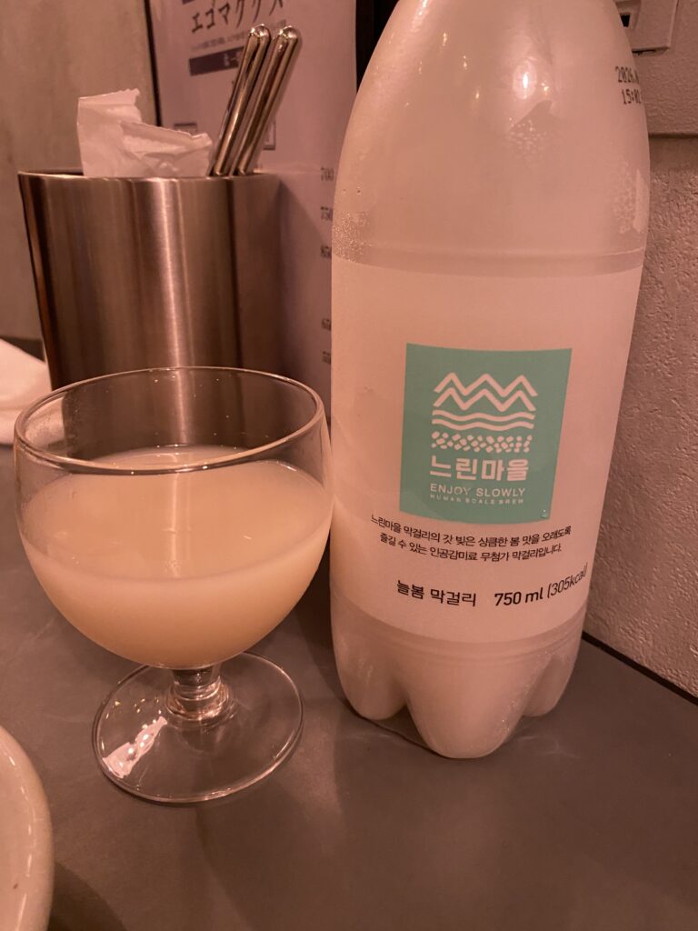 料理と一緒に楽しんだのはマッコリ。乳酸発酵由来のやさしい酸味と微炭酸が、辛い料理や濃厚な味付けに驚くほどよく合います。特にナッコプセのようなスパイシーな鍋と合わせると、口の中をリセットしてくれるような爽快感があり、ついつい杯が進みました。