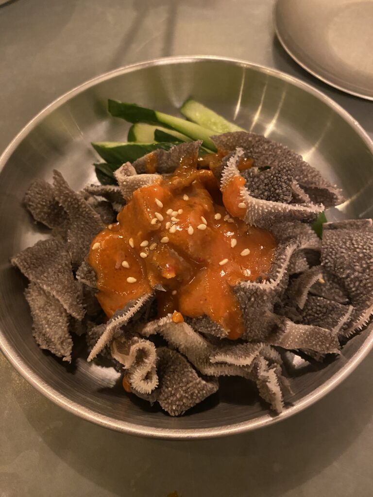 もうひとつ印象的だったのが センマイ刺し。新鮮だからこそのコリコリした食感が楽しめる一品です。ふと思ったのは、「このセンマイにタイチネの生キムチの素をかけて食べたら最高では?」ということ。キムチの旨味と香りがセンマイに絡めば、新しい味わいの世界が広がるに違いありません。