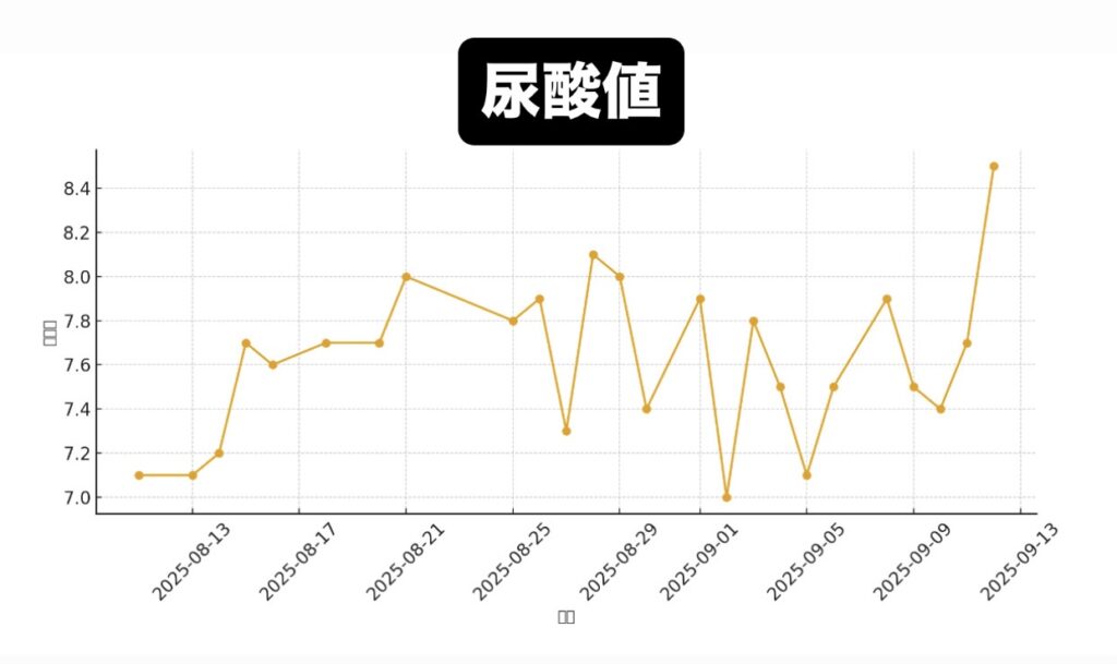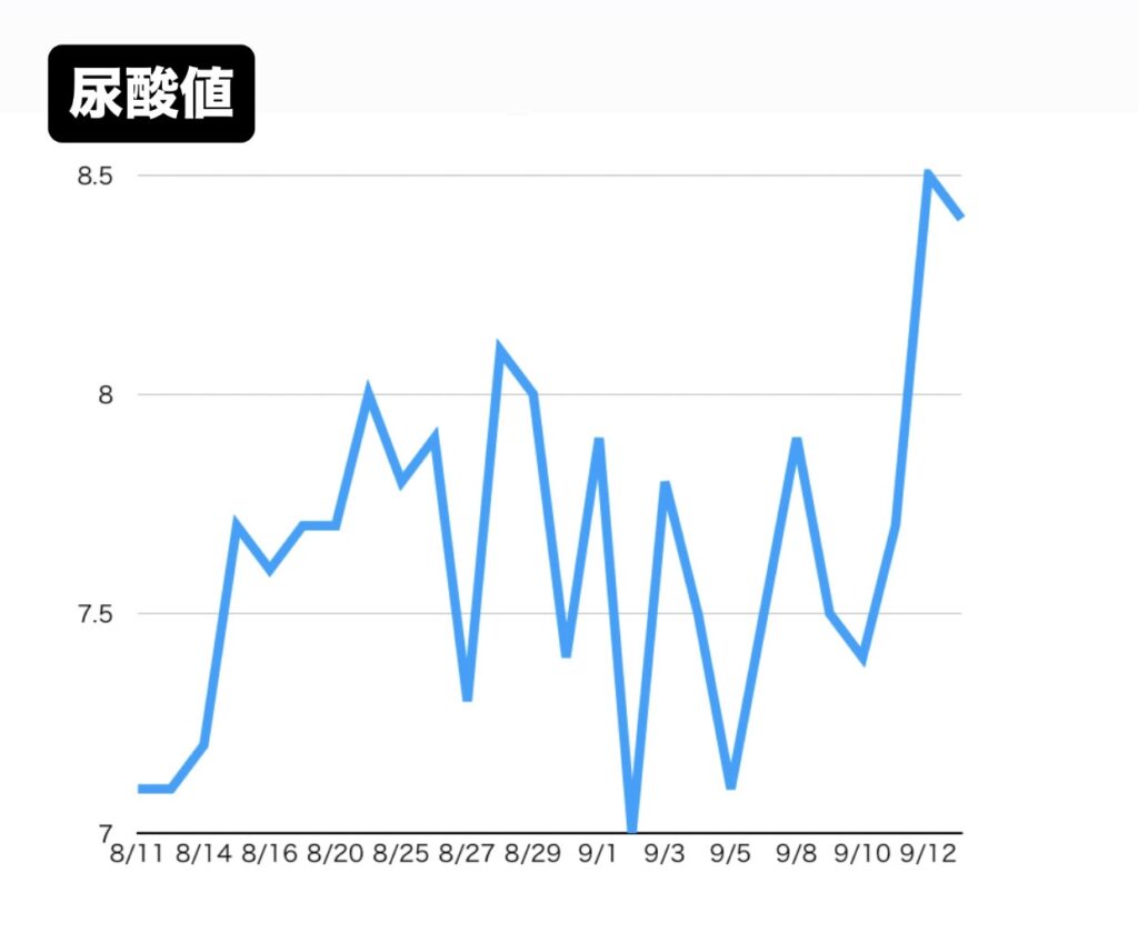 一方、尿酸値は8.4。確かに前日の8.5よりは下がっていますが、ほぼ横ばい。以前であれば「プリン体の少ない食事をすれば翌日にはぐっと下がる」というパターンが多かったのですが、今回は下がりきらない。これが少し気になるところです。