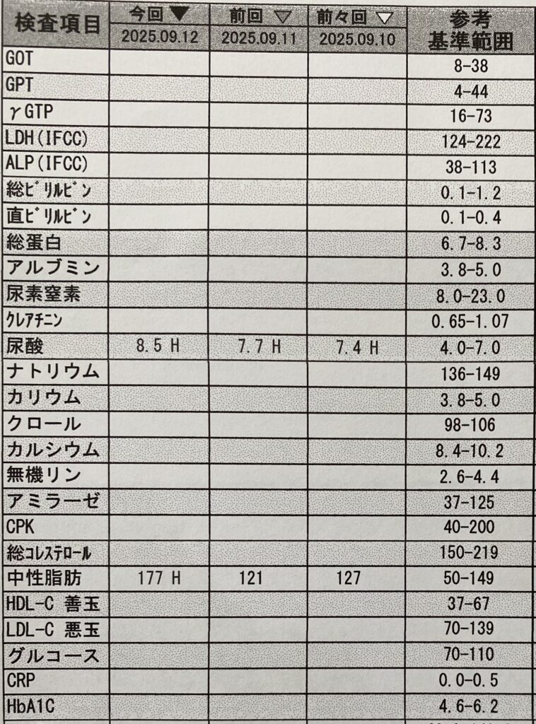 レバーを少量食べただけなのに、尿酸値は8.7から9.0へ。中性脂肪は149から177へやや上昇しました。原因は「その日の食事」ではなく「連日の蓄積」。プリン体を処理しきれず、ついに危険水域へ達してしまったと考えられます。