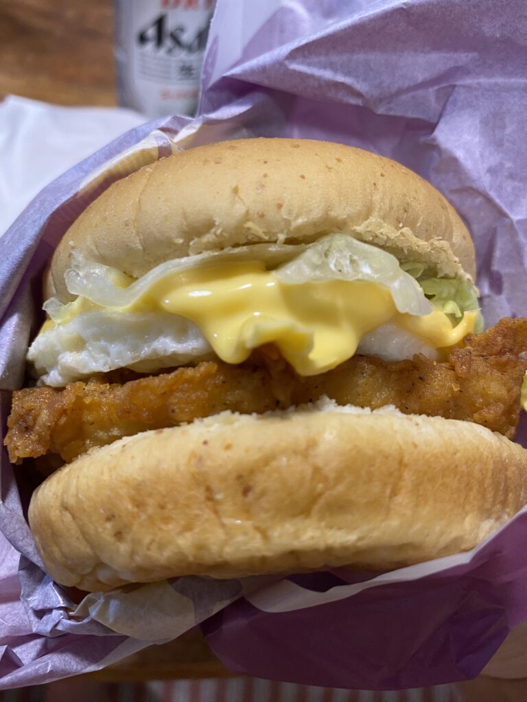 季節限定の「月見シリーズ」は、この時期ならではの楽しみ。サクッと揚がったチキンフィレに、とろりとしたチーズと卵が重なり、バンズに包まれた瞬間から食欲を刺激します。脂っこいのに、なぜか飽きがこない。濃厚なのにどこか軽やかに感じるのは、チキンフィレの肉質と衣のバランスのおかげかもしれません。