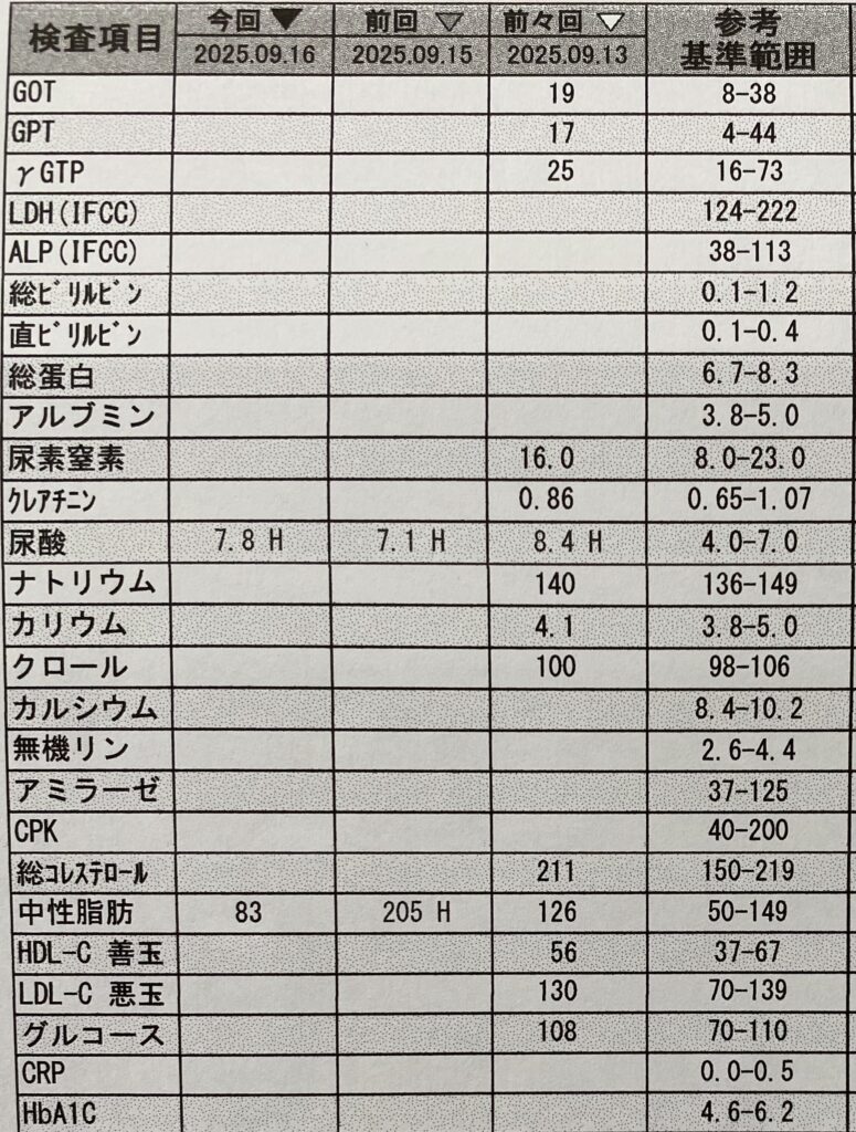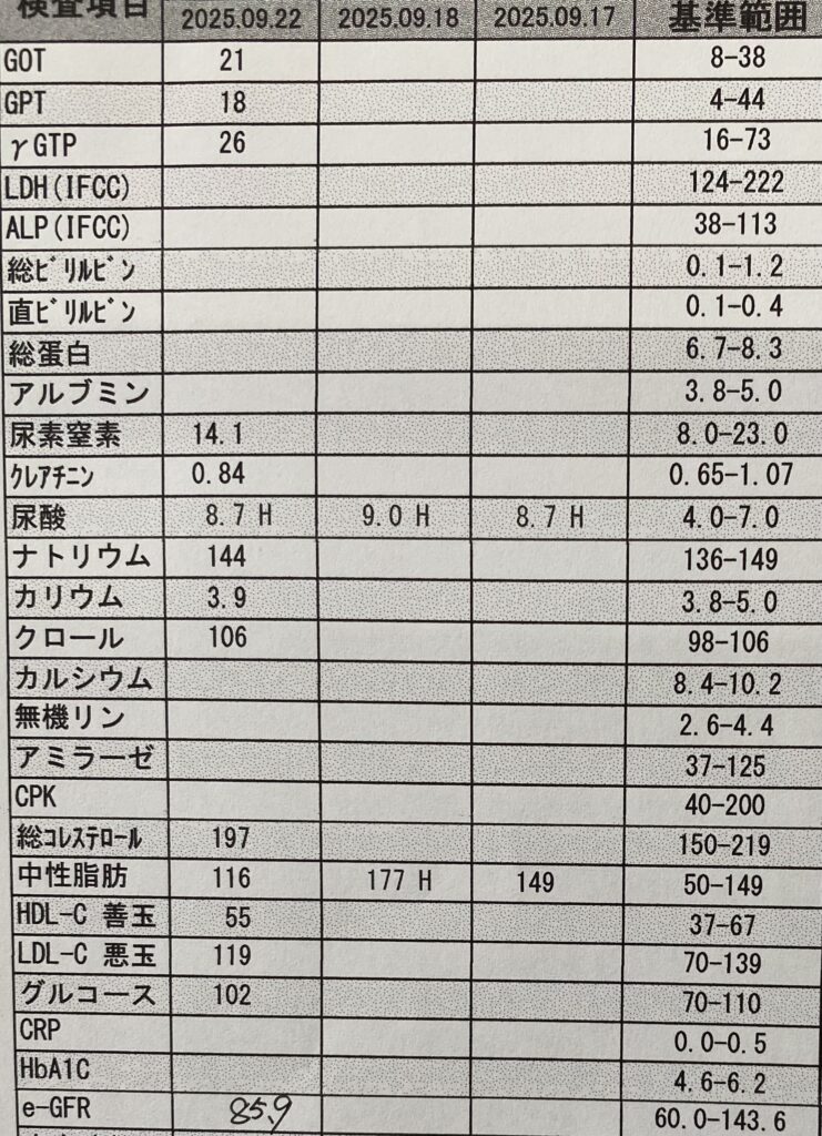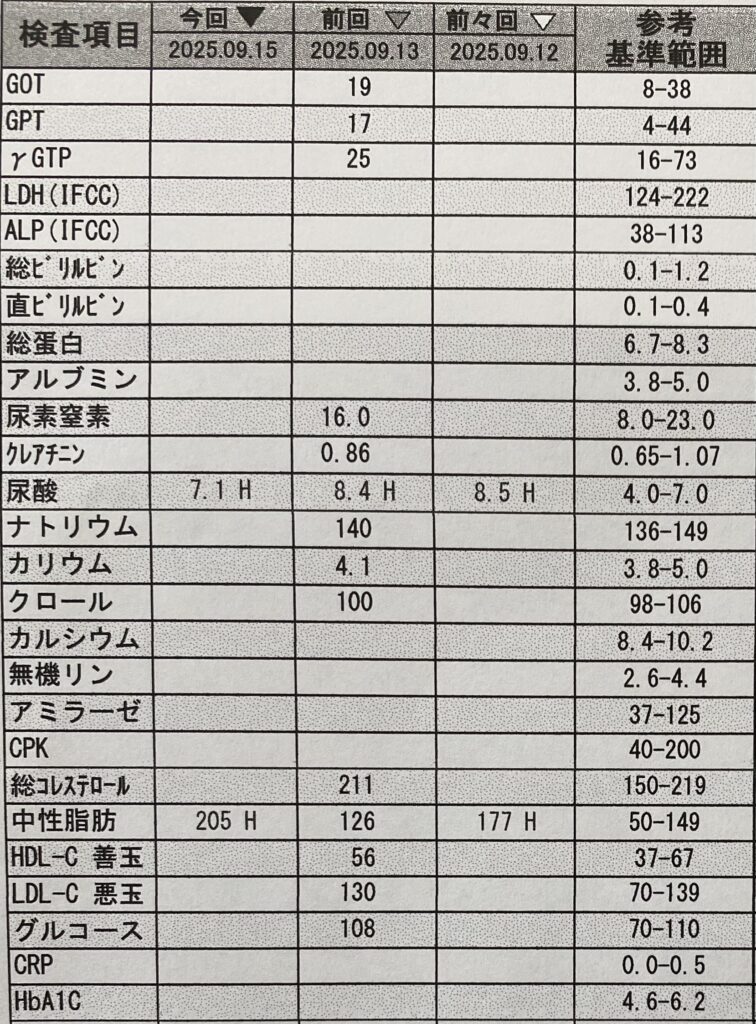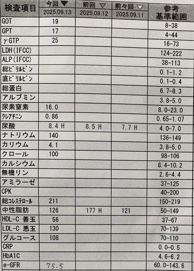 週末ということもあり、肝機能・腎機能も併せて検査しました。結果は問題なし。コレステロールや中性脂肪も基準値内で、大きな異常は見られませんでした。数値だけを見れば「危険水域」に近づいている尿酸値が気になりますが、他の臓器機能はしっかり保たれているというのは安心材料です。