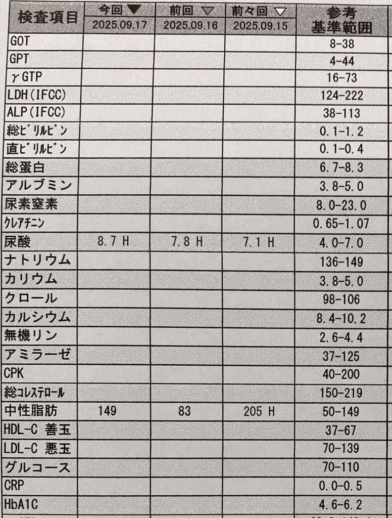 一方の尿酸値。9.0から8.7へとわずかに低下しましたが、依然として高値。基準値7.0未満からは遠く、改善したとは言い難い数字です。