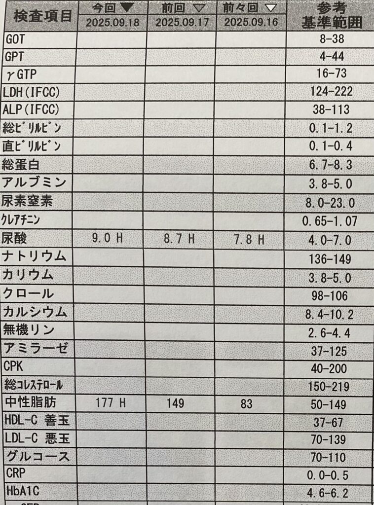 中性脂肪は少し上昇しましたが、問題はやはり尿酸値。ついに「9.0」という数字を叩き出してしまいました。