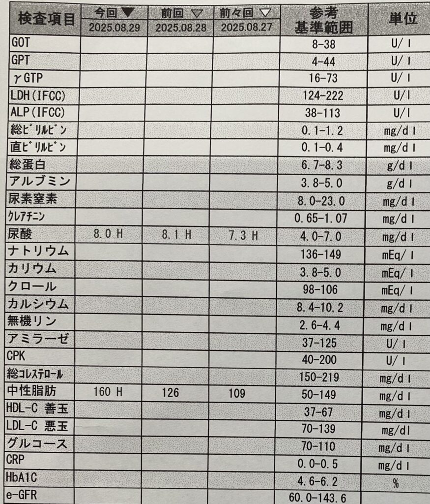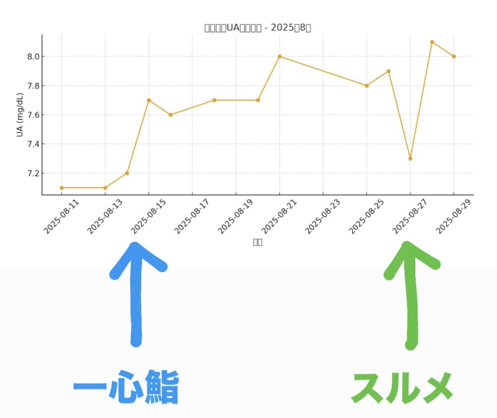 - 尿酸値(UA):伊勢海老を食べた翌日は7.8まで急上昇。その後、連続焼肉をしても7.5までにしかならず、むしろ少し改善。魚介系(特に甲殻類や貝類)のプリン体の影響が大きかったことが分かります。