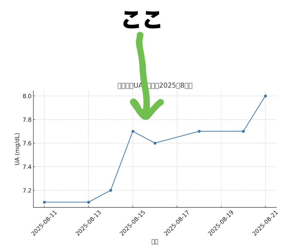 - 尿酸値(UA):7.8 → 7.9(上昇)