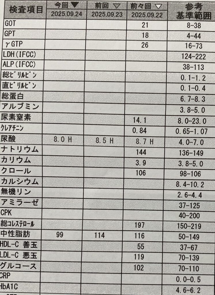 尿酸値は即日で反映されるとは限らず、数日前の食生活やアルコール摂取状況によっても左右されます。今回は直前の食事が軽めだったため、カバーできたのかもしれません。
