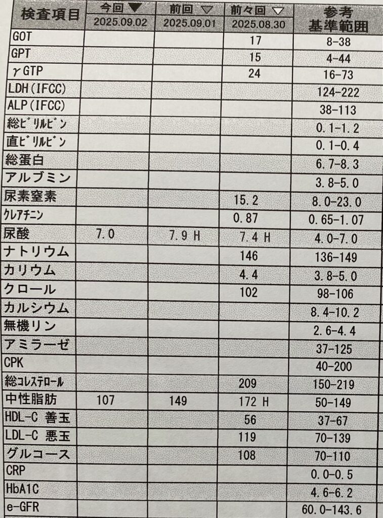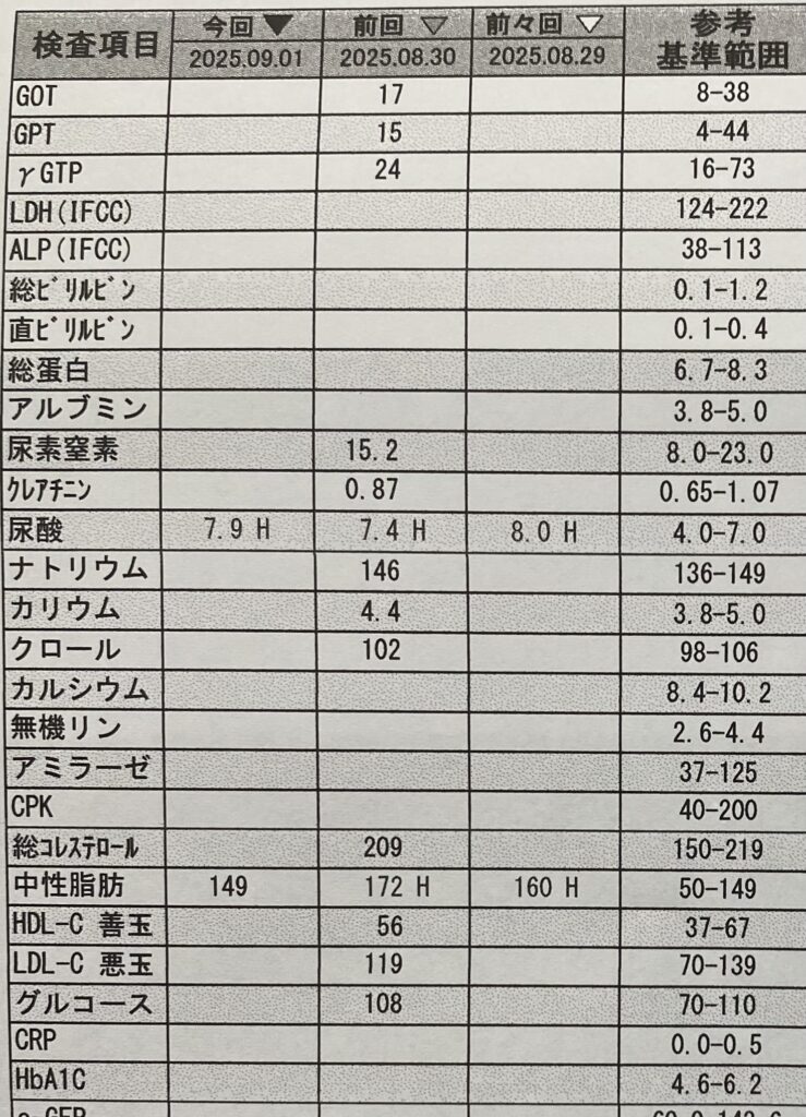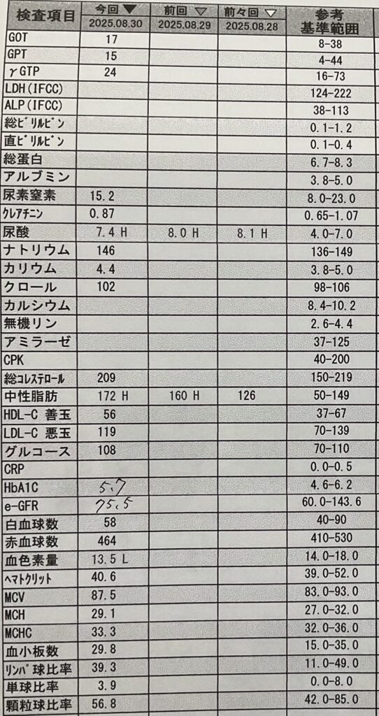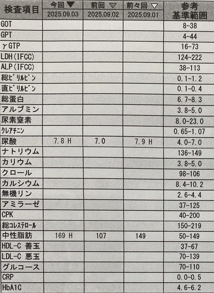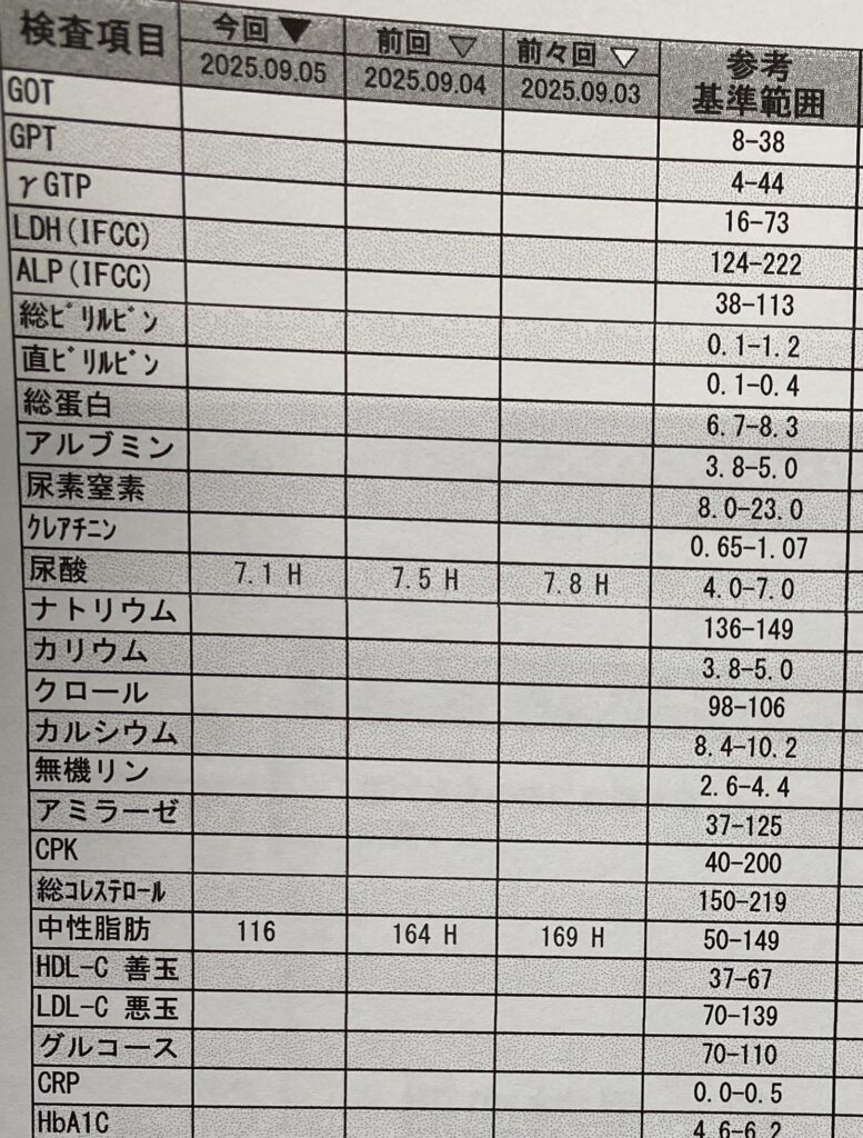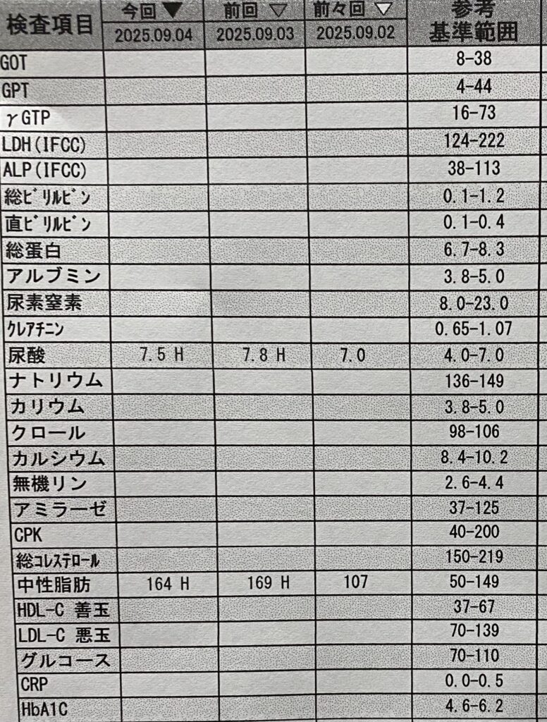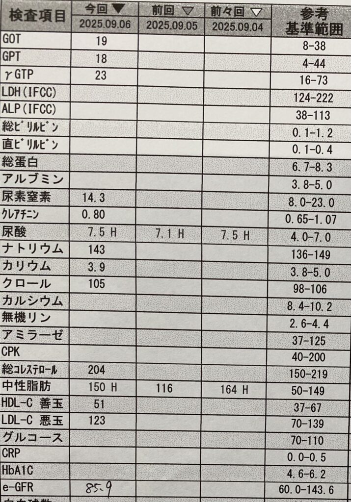 尿酸値は7.1から7.5へ上昇。そして中性脂肪は116から150に上がっていました。正直、期待していた方向とは逆。数字を見た瞬間「えっ、なんで?」と声が出ました。