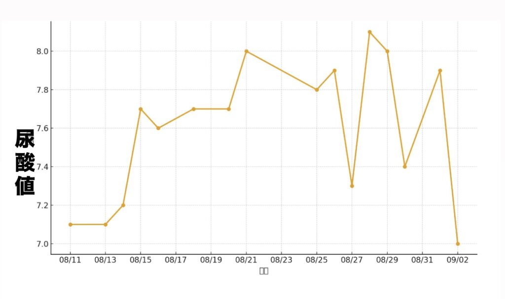 • 尿酸値(UA):7.4 → 7.9(+0.5)